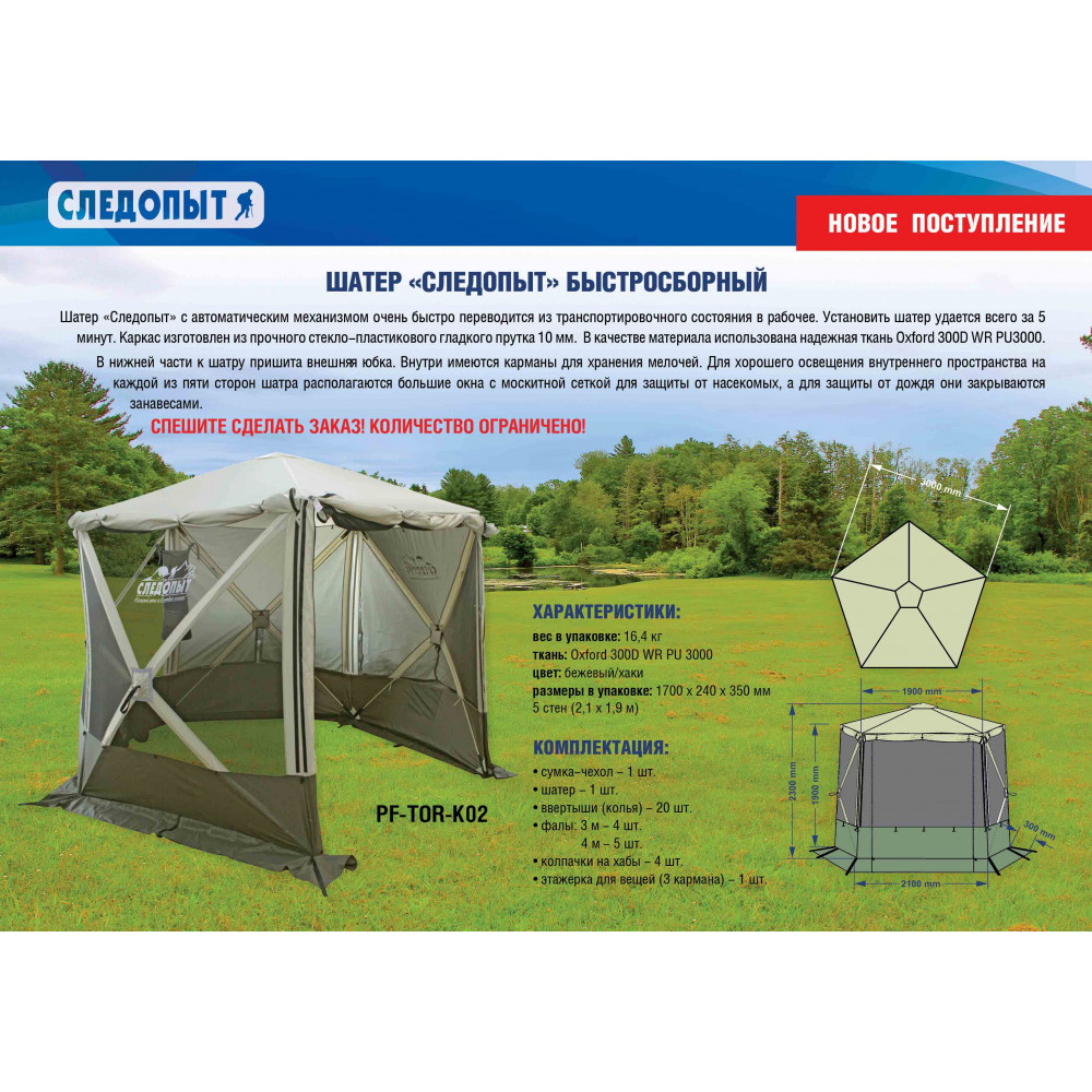 Шатер "Следопыт" быстросборный 2,1х1,9м, h-2,3 м.,5 стен, ткань Oxford 300D WR PU 3000